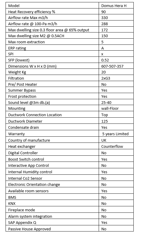 The Domus HRXE-HERA-H provides a maximum flow rate of 288m3/hr suitable for a house up to 172 m2 floor area with up to 5 kitchens & bathrooms